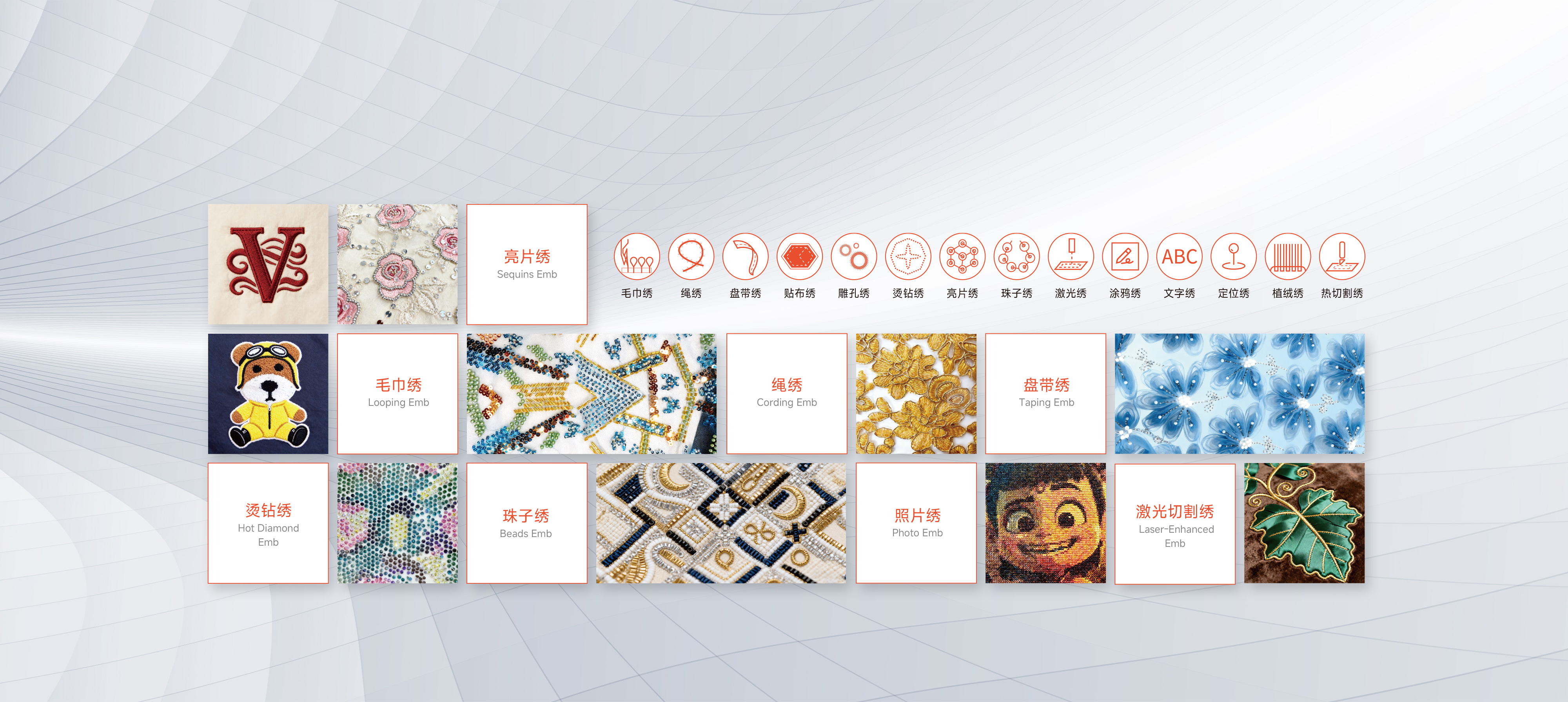 支持疊片、多金片、散珠、簡易繩繡、盤帶、激光、熱切割等特種繡外掛裝置